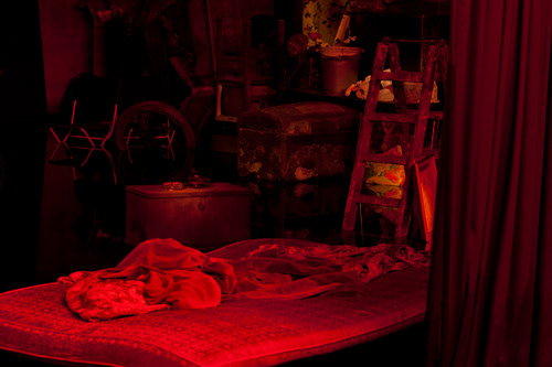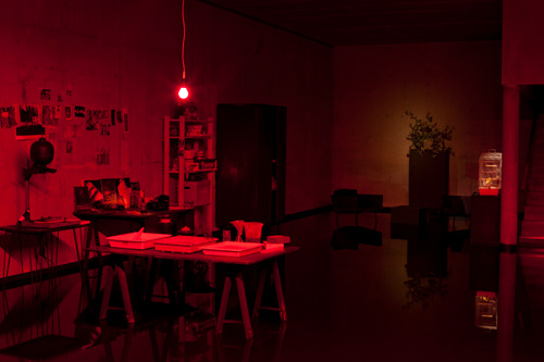 A collection of objects from daily life, some of which were specially painted to catch the light, are carefully staged in this setting. Forgotten and disregarded cheap-sentimental paintings and unused gadgets nonchalantly dispersed and piled, are laid out as a track in order to direct the story toward the artist’s background as a creator of images. The installation functions literally as a huge darkroom that produces pictures as well as impressions. With a disturbing ambiguity, Hintersteg is giving hints of a physical presence and recent use, yet at the same time expresses alienation. It seeks the tension between what is livable and intolerable, what is rotting away and needs restoration – the tension between staying and leaving. The blanket covering the mattress might indicate that someone slept there until recently.